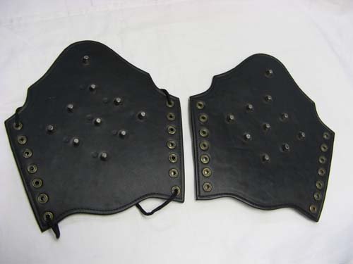 This Roman Arm Guard set is crafted with durable black leather and adorned with metal studs. It is fully adjustable for the wearer and fits most adult arms. Each guard measures approximately 10" wide and 11" long.